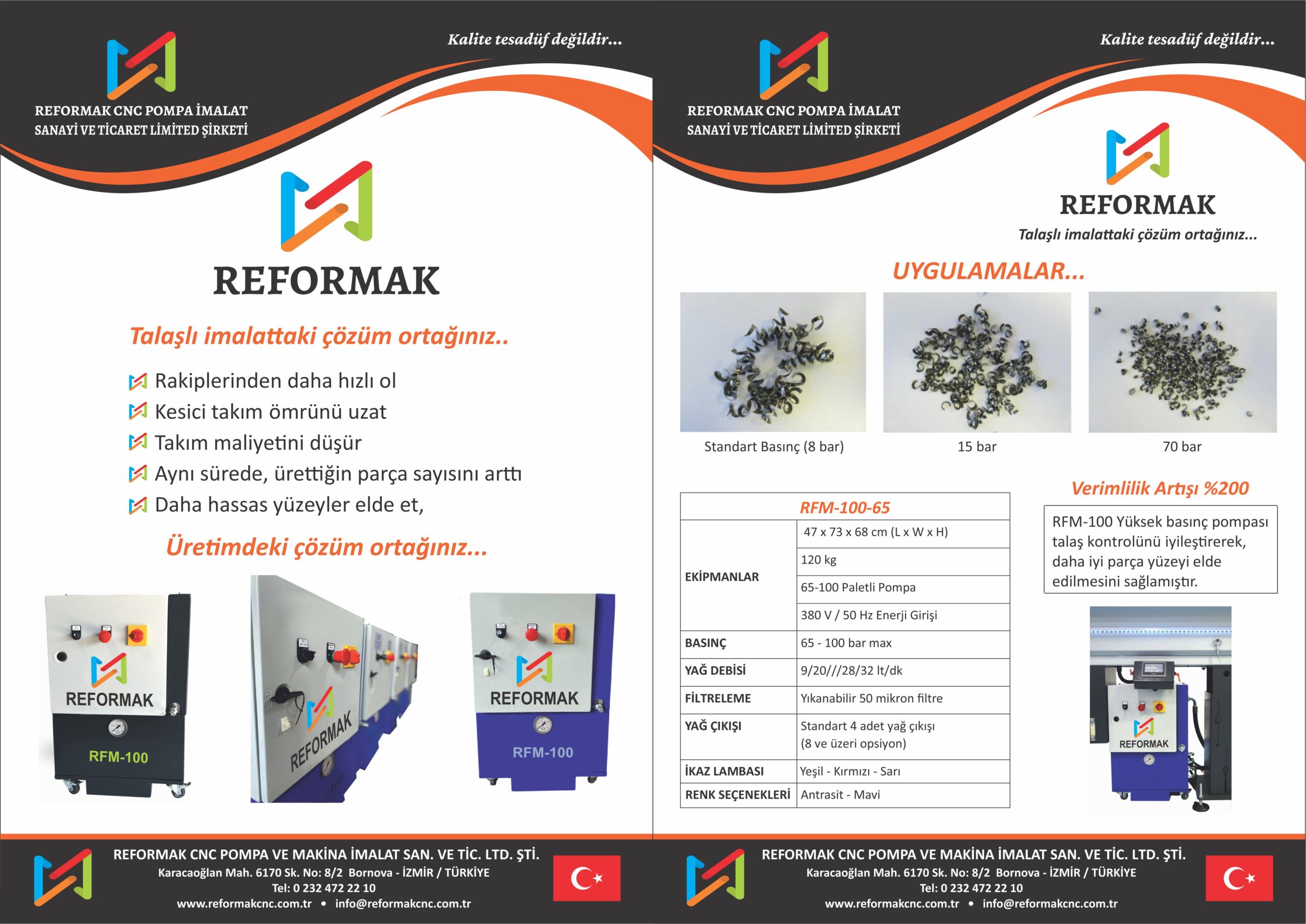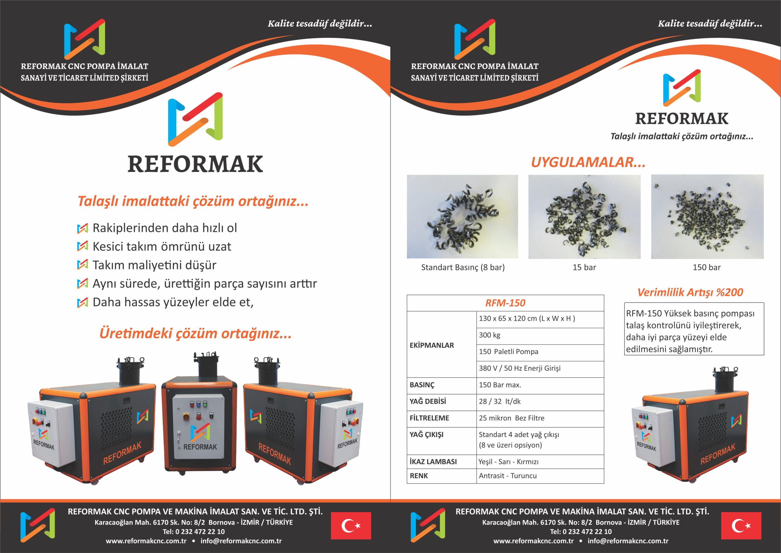 Reformak olarak sunduğumuz yüksek basınçlı pompa sistemleri, talaşların etkin şekilde uzaklaştırılmasını sağlar; bu da kesici takım ömrünü uzatır, yüzey kalitesini artırır ve takım değiştirme sürelerini minimuma indirir. RFR-100-65 ve RFR-150 modellerimiz, farklı basınç ve debi ihtiyaçlarına özel olarak tasarlanmış olup, üretim sürecinde %200’e varan verimlilik artışı sağlar.